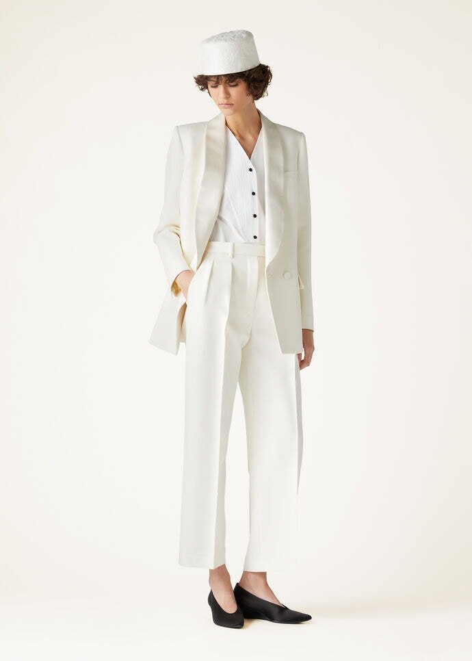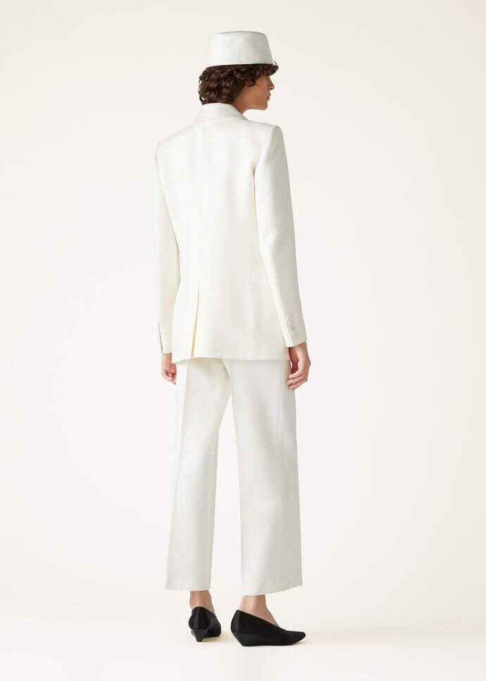 In the soft glow of the evening, the Bart pants emerge as a vision of refinement untouched by the passing of time. Crafted from a wool and silk blend, these straight-cut pants with a slight kick flare offer the perfect balance of structure and fluidity. The pressed crease and subtle pleats at the top add a touch of volume and sophistication, while the fabric-covered button at the waist ensures a seamless finish.