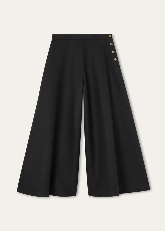 Blending ease with an effortless silhouette, the Frank pants have a flowing line. The wide-leg design is crafted from Barathea cloth, a lustrous fusion of wool and silk that drapes fluidly as it retains its gentle structure. Eye-catching Goccia jewel buttons at the side lend interest and a final touch of refinement.
