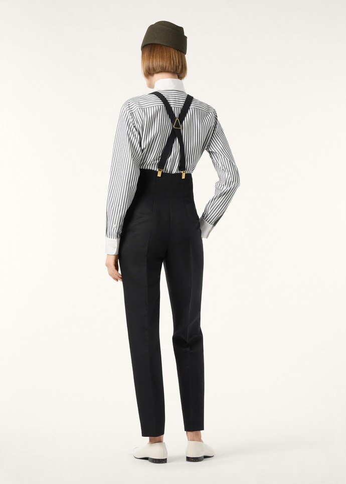 A modern interpretation of classic tailoring, the Joby pants are cut from Barathea, combining the warmth of wool with the luster of silk. The high-waisted silhouette is slim along the leg and cropped just above the ankle, highlighting a clean pressed crease detail. Adjustable fabric suspenders and a concealed side fastening add charm.