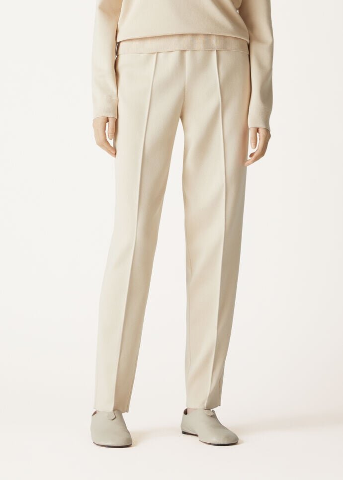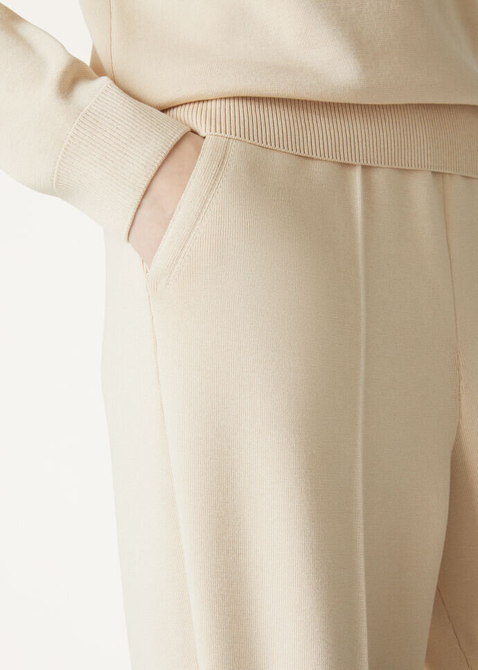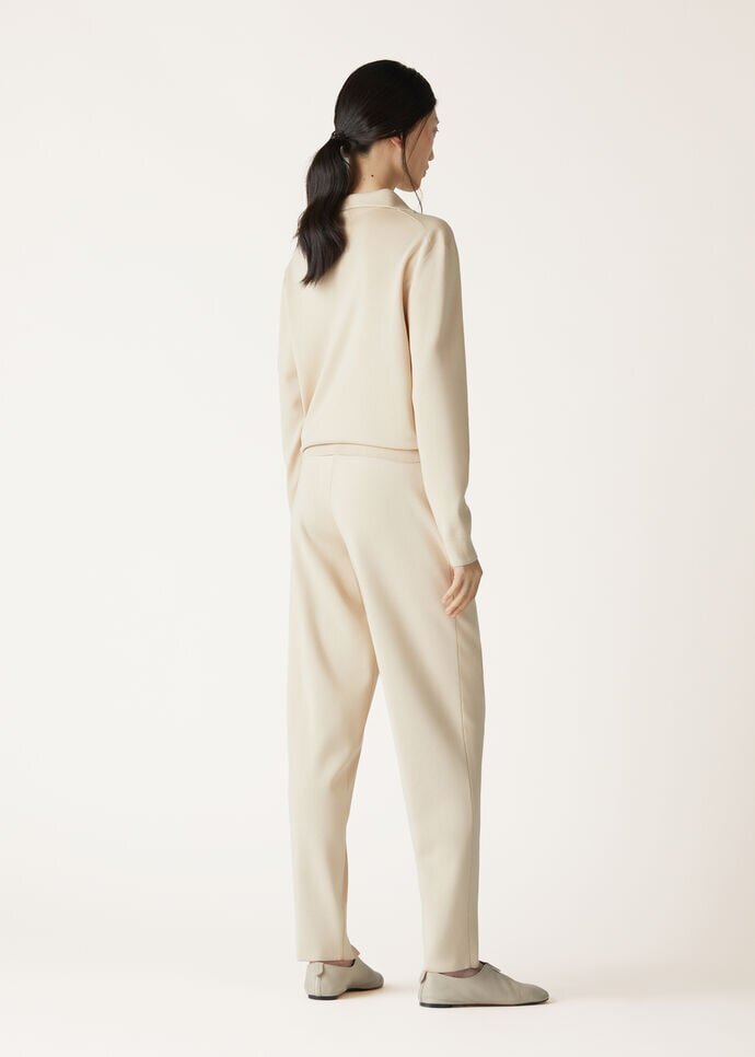 Our women’s pants collection is an exquisite mêlée of masculine and feminine elements, framing the female silhouette in clean, sculpted lines and refined nuances. Crafted from a rich blend of cotton and silk in a plain knit, these sophisticated pants drape effortlessly over the body. The relaxed cut and elasticated waistband ensure exceptional comfort and fluidity.