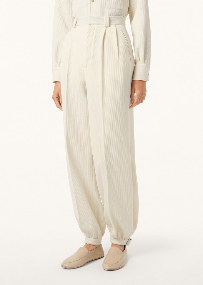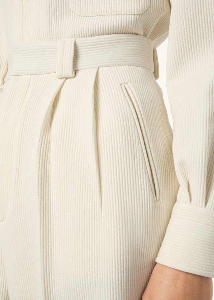 An elegant and clean-lined transitional garment, the Thom pants are cut from a tactile wool piqué that recalls the look and feel of corduroy. Complete with belt loops, the waistband sets a refined foundation for a shaped leg that tapers neatly to cuffed, metal-buckled hems.
