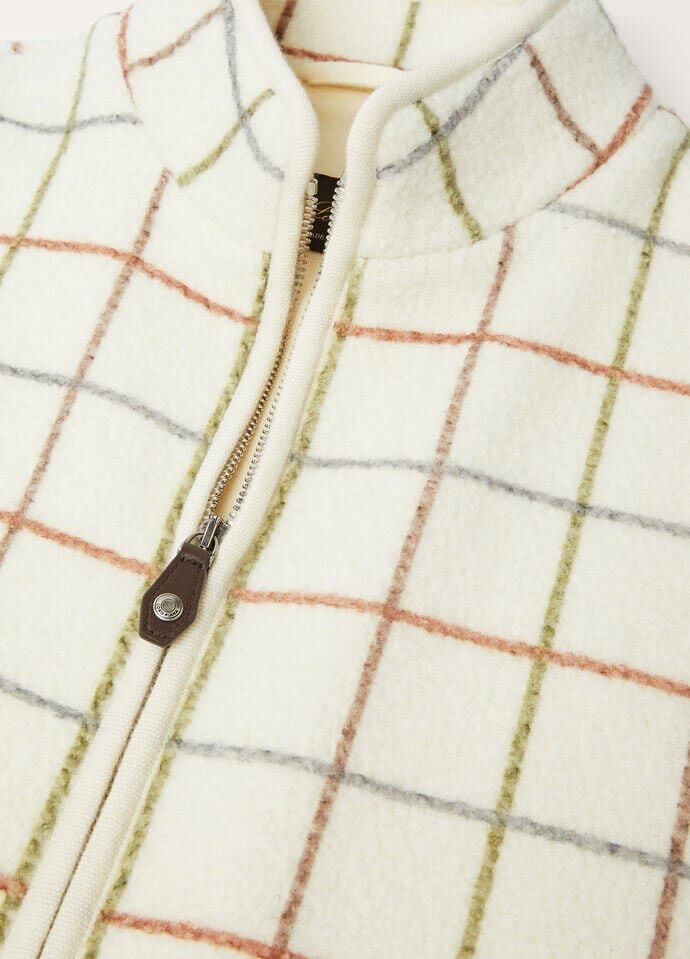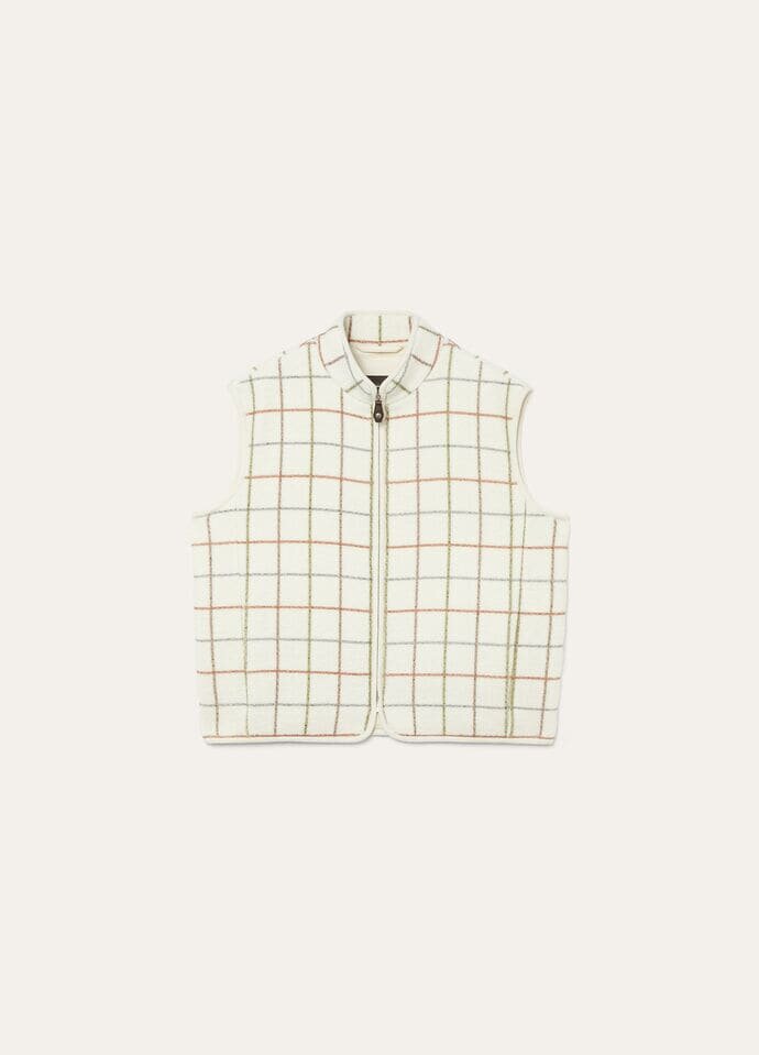 Classic and versatile, the Flores vest is made with Prized Wish Wool and fine Cashmere to create a downy fabric of enveloping warmth. It is decorated with the iconic Belt motif print for visual interest, enhancing the fabric’s rich texture. The standing collar and Cashmere jersey add considered and practical finishing touches.