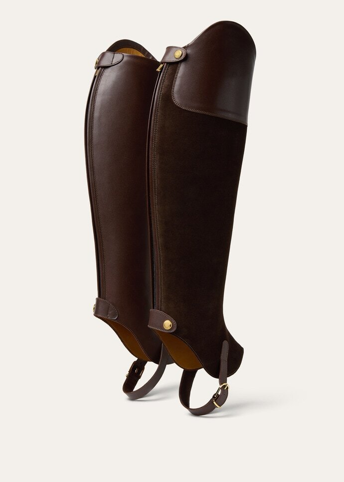 Crafted from supple calfskin with a suede panel along the outer leg, the Horseriding gaiter is the perfect complement to the matching ankle boot. It fastens at the back with a full-length zip, anchored beneath the sole by a slim buckled strap. A double-circle button at the base punctuates the accessory with a considered finish.