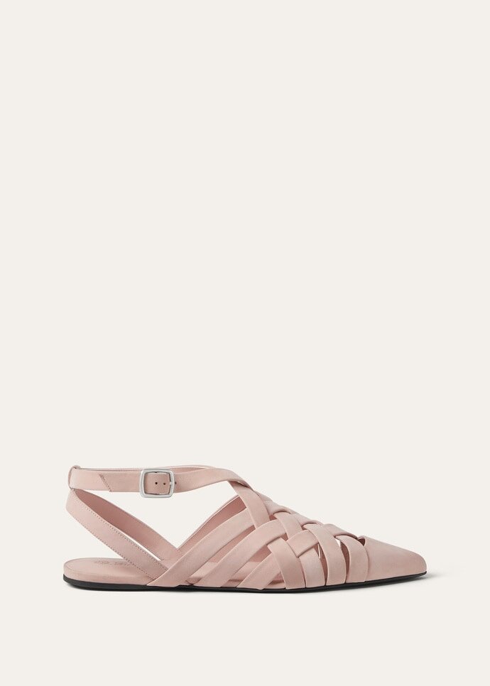 With its intricate cage design, the Silene flat is primed to complete myriads of ensembles through late summer and beyond. Its straps are cut from nubuck calfskin, evoking the softness of cashmere and casting a delicate woven pattern. The pair is neatly secured with an ankle strap and balloon-shaped buckle.