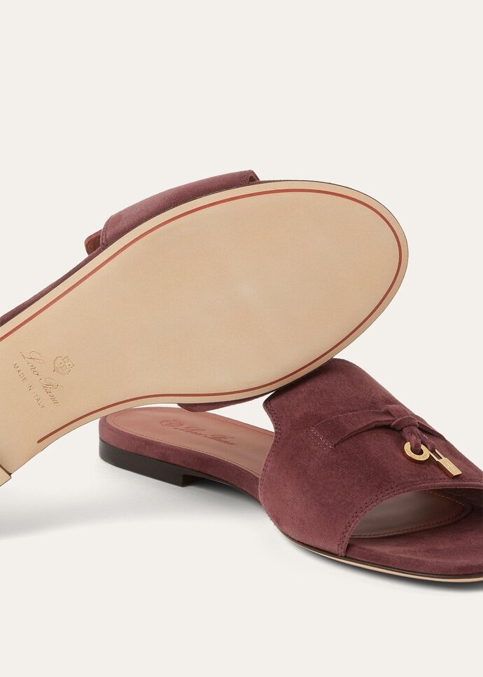 Suede sandal accessorised with a band featuring Loro Piana’s My Charms, edged with tonal stitching. Refined, feminine footwear, perfect both in the city and on holiday.