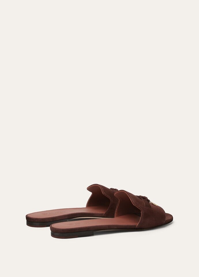 Suede sandal accessorised with a band featuring Loro Piana’s My Charms, edged with tonal stitching. Refined, feminine footwear, perfect both in the city and on holiday.