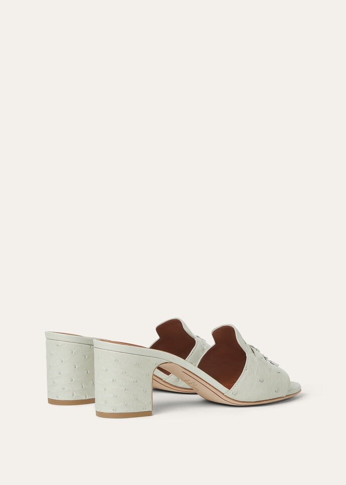 Sandals featuring a wide strap made from soft, meticulously selected ostrich leather, a material defined by its naturally matte surface and irregular grain. Embellished with a front strap featuring miniature My Charms pendants, their design is inspired by the classic Summer Charms Walk loafer.