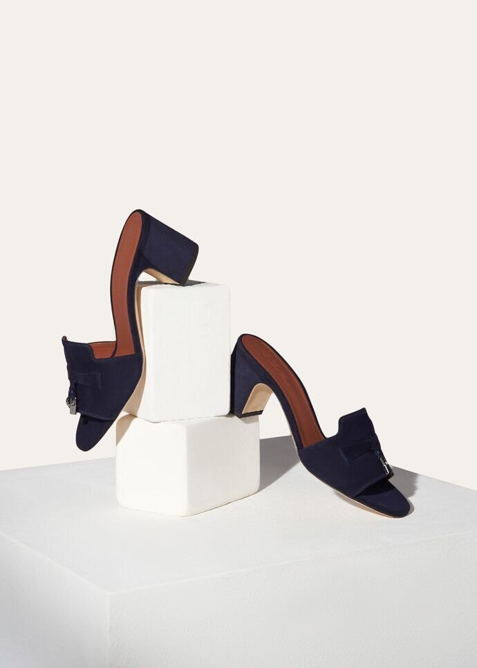 Suede sandal with a band featuring Loro Piana My Charms, framed in tonal stitching. Refined and elegant, perfect both for city dressing and resort holidays.