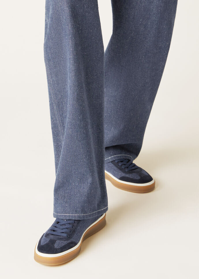 Inspired by the tennis court but designed for year-round wear, these sneakers combine sporty flair with refined craftsmanship with their exclusive cotton denim uppers and ultra-low silhouette. The caramel-hued cupsole features a unique dual-sole aesthetic, punctuated by an off-white rubber edge. The result is an intriguing color contrast ideal for polished athleisure looks.