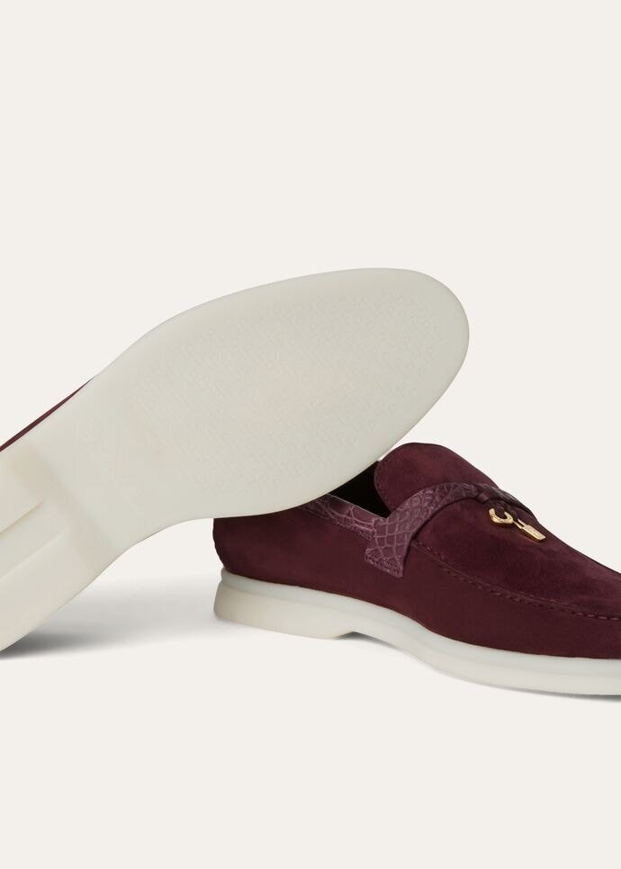 Soft suede loafers featuring caiman-skin details and front saddles with miniature My Charms pendants. The soles are made from rubber — a sporty feature common to all Loro Piana shoes.