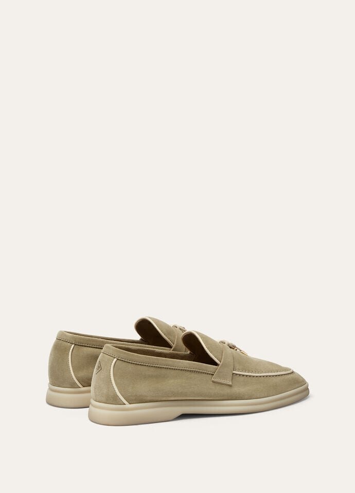 Iconic suede loafers. They feature soft nappa leather piping and suede saddles with Loro Piana My Charms.