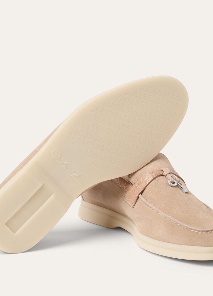 Unlined suede loafers featuring alligator-skin inserts and a front strap with miniature My Charms pendants. Inspired by the design of boat shoes, you can place your own name on their white rubber soles — a common feature of all Loro Piana sportswear shoes.