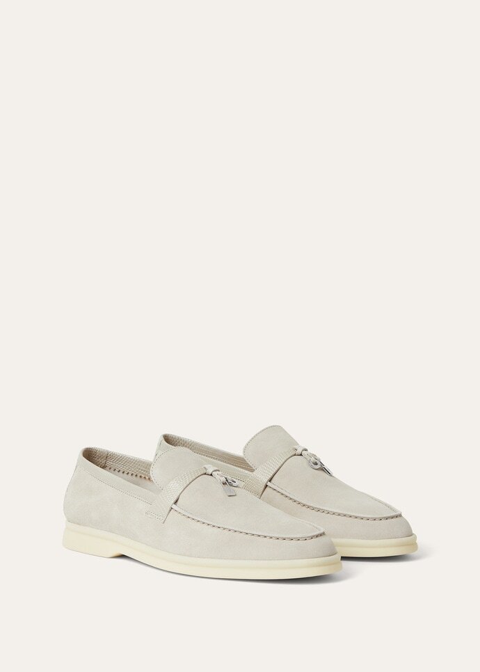 The Summer Charms Walk mule is defined by its pared-back open silhouette. It is crafted from rare Infinito Crocodile, worked for the perfect balance between depth, sheen and texture. The wide upper band anchors a set of Loro Piana My Charms, offering a playful contrast with the minimal structure beneath.