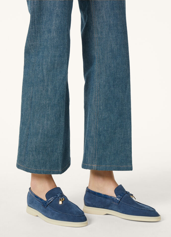 Unlined suede loafers featuring alligator-skin inserts and a front strap with miniature My Charms pendants. Inspired by the design of boat shoes, you can place your own name on their white rubber soles — a common feature of all Loro Piana sportswear shoes.